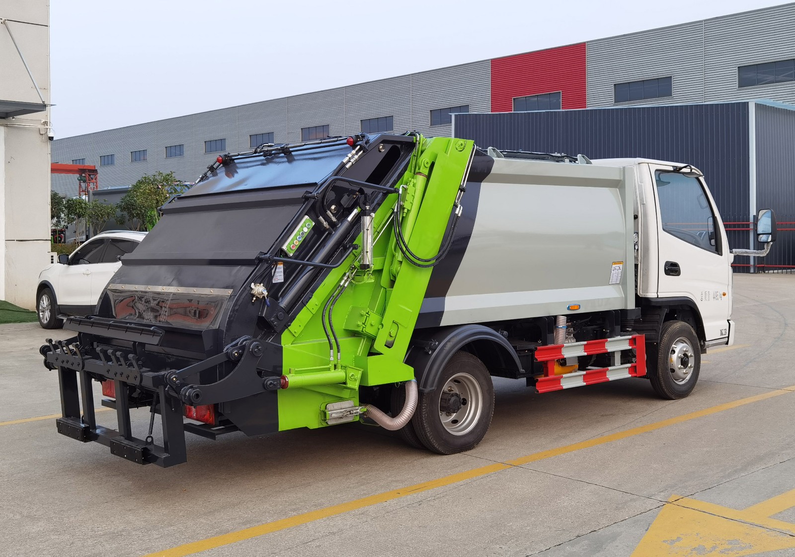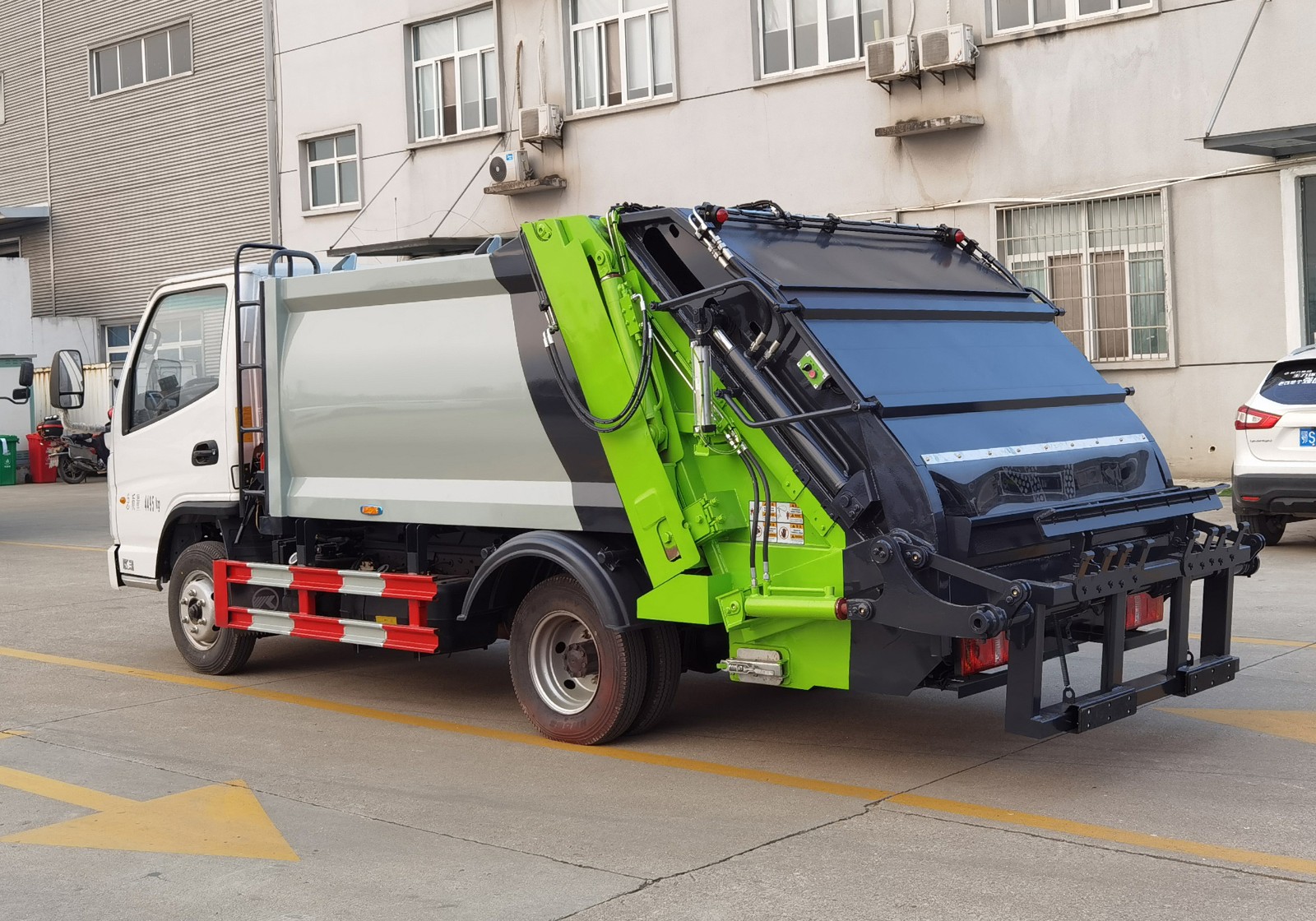 上裝部分的技術參數包括箱體容積、壓縮倍率和裝料時間等。液壓系統的控制閥、油缸、連接管路等關鍵件采用了先進的結構和技術,性能可靠,操作簡單,維修方便。先進的電控系統采用了進口PLC(可編程序控制器)集成控制,機電液一體化控制,自動化程度高。推板控制閥設有背壓閥,在實現雙向壓縮垃圾的同時,推板能自動向箱體前方移動,從而調整了容納垃圾的空間,裝載效率高。流線型外觀設計精美,上裝部分采用專用高強度防腐鋼板,提高了車輛使用壽命。